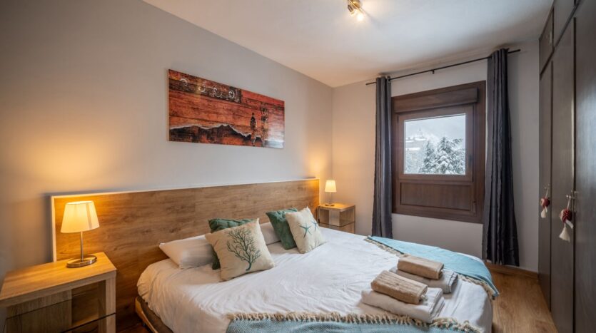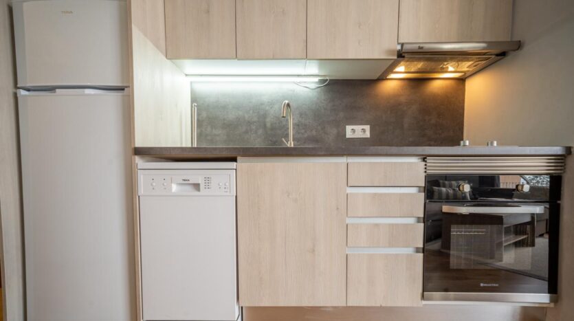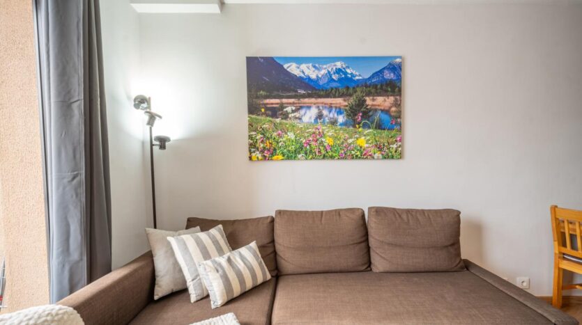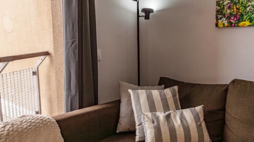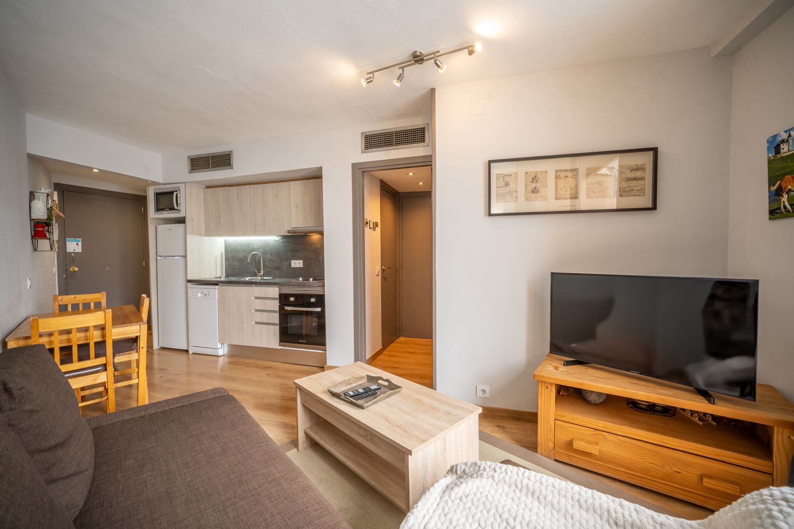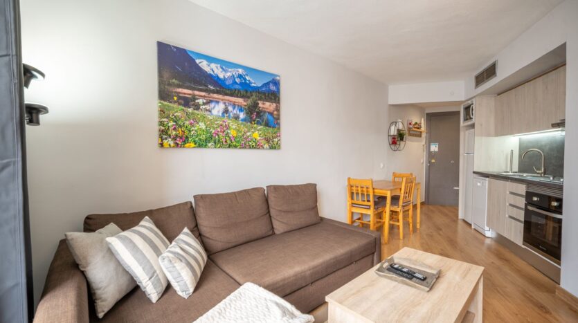 El apartamento se distribuye en un dormitorio, un baño completo, una cocina abierta integrada en el salón-comedor y una agradable terraza privada con vistas despejadas a la montaña, perfecta para relajarse y disfrutar del entorno natural. Su orientación y altura proporcionan una magnífica luminosidad natural durante todo el día.